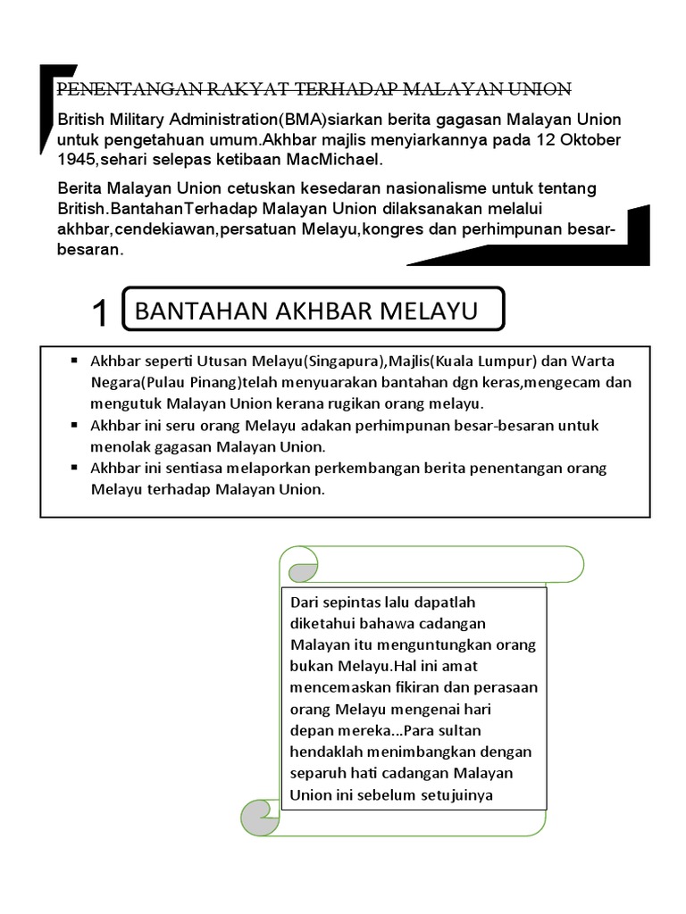 The malayan union was a union of the malay states and the straits settlements of penang and malacca. Penentangan secara kolektif peranan kaum. Reaksi orang melayu terhadap malayan union pengenalan pengenalan malayan union merupakan pertubuhan negara dana bangsa yang diperkenalkan oleh british pada tahun 1946 untuk menghapuskan negara dan bangsa melayu yang dibina sejak zaman kesultanan melayu melaka. Bab 4 4 3 ting 4 kssm pages 1 25 text version anyflip. Orang melayu menentang malayan union kerana: •the power of the malay rulers was eliminated in the affairs of the state administration •singapore is separated from the union and remains an english colony •liberal citizenship based on jus soli principles •equal rights to. Malayan union resistance learn with flashcards, games and more — for free. Bentuk / cara apenentangan orang melayu terhadap malayan union peranan dato onn jaafar â· menyeru semua pertubuhan melayu peranan sultan melayu sokong tindakan umno memulaukan perlantikan gabenor malayan union. · menentang pembentukan bangsa malayan union. Pengenalan malayan union pada tahun 1946 merupakan usaha british untuk menghapuskan negara dan bangsa yang telah dibina sejak zaman kesultanan melayu melaka. Orang melayu telah melakukan pembantahan terhadap pelaksanaan malayan union dan antara bantahan yang telah dilaksanakan oleh orang melayu adalah dengan. Üjumlah orang melayu menjadi kecil kerana. Penentangan terhadap malayan union begitu kuat sehingga rancangan tersebut tidak dapat dikuat kuasakan sepenuhnya.